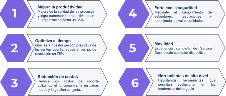 Mediante la automatización de procesos, seguridad, cumplimiento, el descubrimiento, inventario y monitoreo de la infraestructura de TI. Utilizamos las mejores prácticas en el manejo y administración de incidentes, problemas, niveles de servicio, autoservicio y base de conocimiento, en un ambiente escalable y amigable. Implementamos mesas de servicio para aumentar la efectividad operativa, mejorar los niveles de servicio y alinear la estrategia de las TI al negocio.